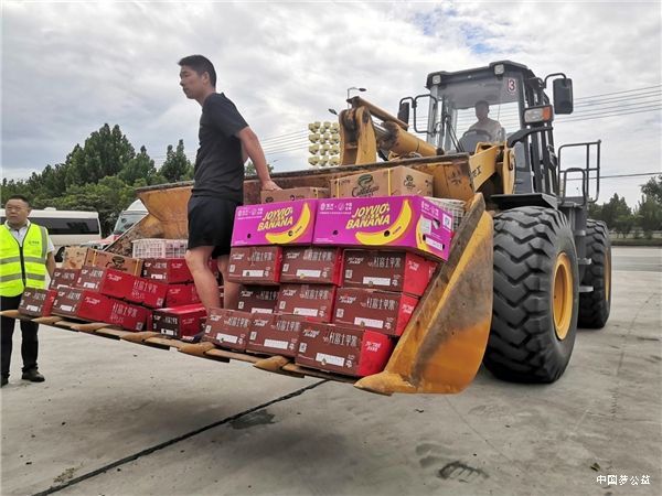 铲车接力运送赈灾爱心水果。
