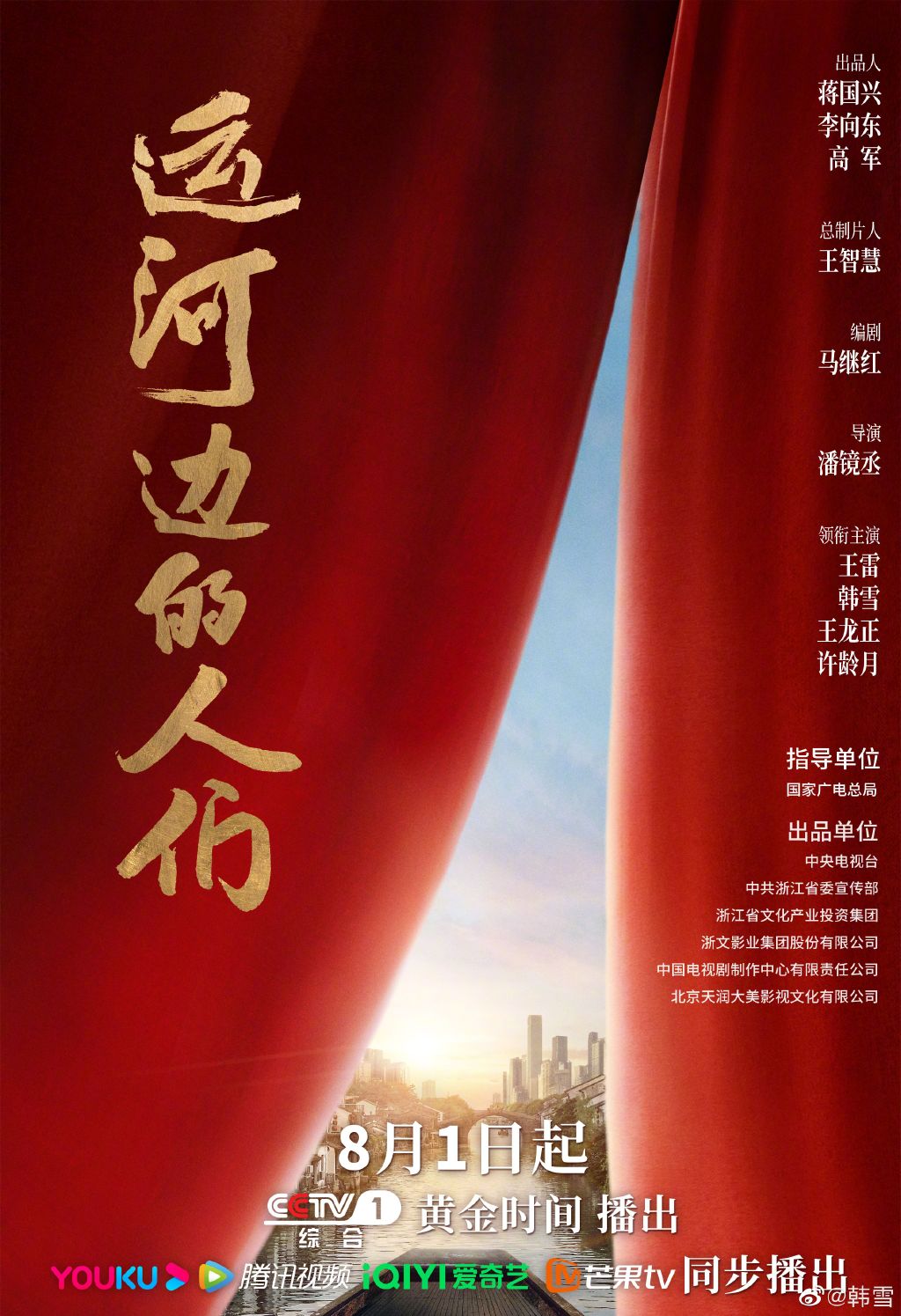 《运河边的人们》是由潘镜丞执导,王雷、韩雪、王龙正、许龄月领衔主演,马少骅、于洋、陈逸恒、徐百慧、徐娇、李光复、董勇、郑卫莉、王仁君、何明翰、张秋歌等主演的重点剧。该剧于2022年8月1日在央视一套播出,并在优酷视频、腾讯视频、爱奇艺、芒果TV同步播出 。