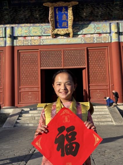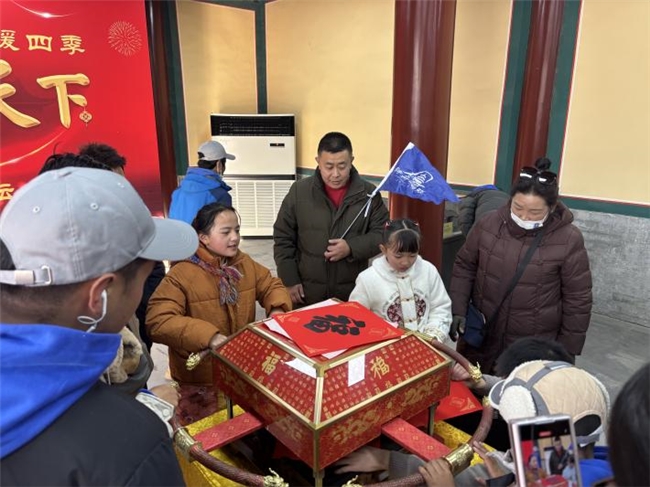 小朋友们在象征团圆的龙形把手上共同按下,将中国传统印刷技艺与现代节日庆祝相结合,一张张印制在先农坛定制宣纸上的“福”字就这样印成了。白玛措姆拿着自己压好的福字,开心地说:“我要把这个福字带回去,送给我的家人,祝他们幸福!”